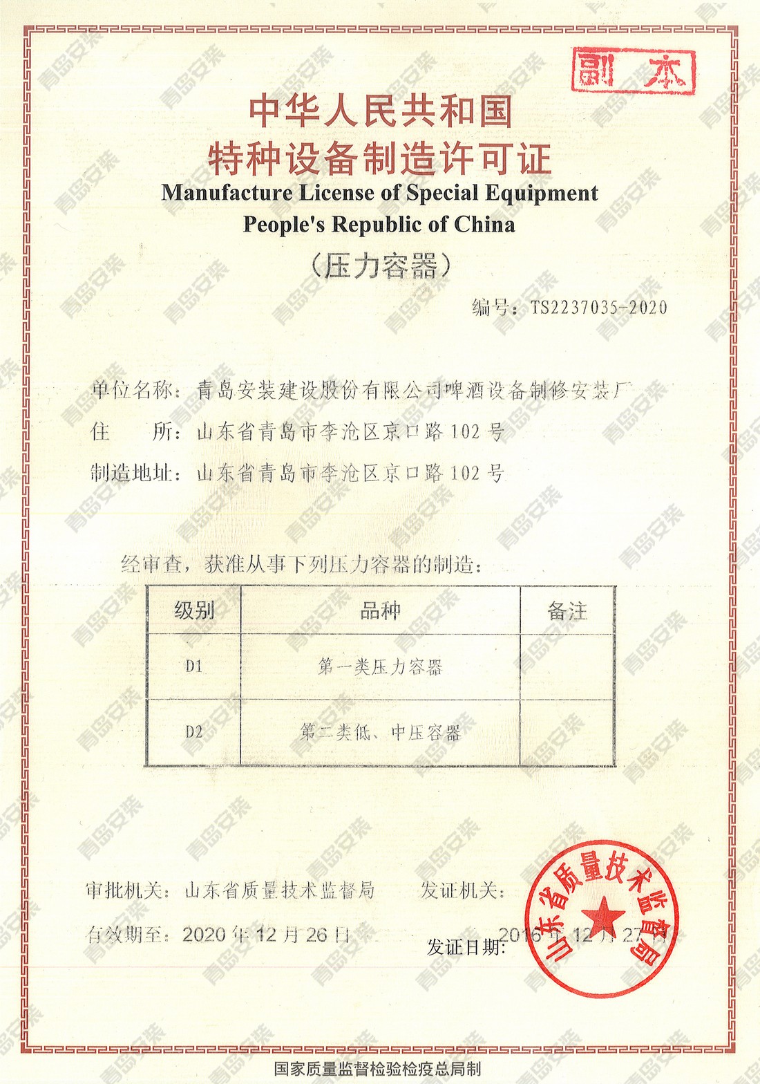 特种设备安装改造维修许可证-压力容器